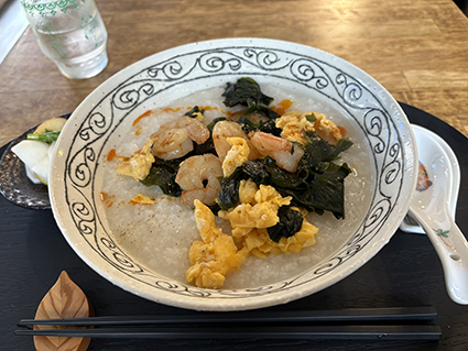 水穀茶房 祝開店! 2026/01/11 21:49 明けましておめでとうございます。新年明けて1月7日に水穀茶房さんのお店オープンしました。薬膳茶と台湾カステラのお店をご夫婦で経営されています。平日はランチもされています。2日遅れでお祝いに駆けつけランチをいただきました。写真はエビとほうれん草のお粥です。新規オープンに伴い、ロゴ、ショップカードのデザインを手がけました。ロゴ作成にあたり陰陽マークはマストというご要望でしたのでショップカードに龍と鳳凰をあしらって東洋的かつ無国籍っぽさを表現できたらとデザインしました。今度は本命の薬膳茶とカステラをいただこうと思います。